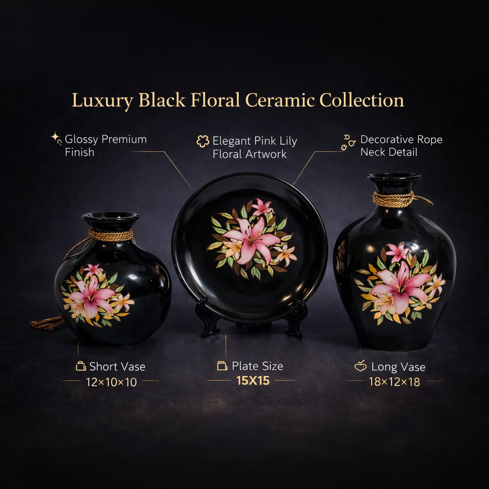 Luxury Black Floral Ceramic Vase & Plate Set – Glossy Finish Decorative Flower Vases with Elegant Pink Lily Design | Modern Home Décor Centerpiece (Set of 3) #3013