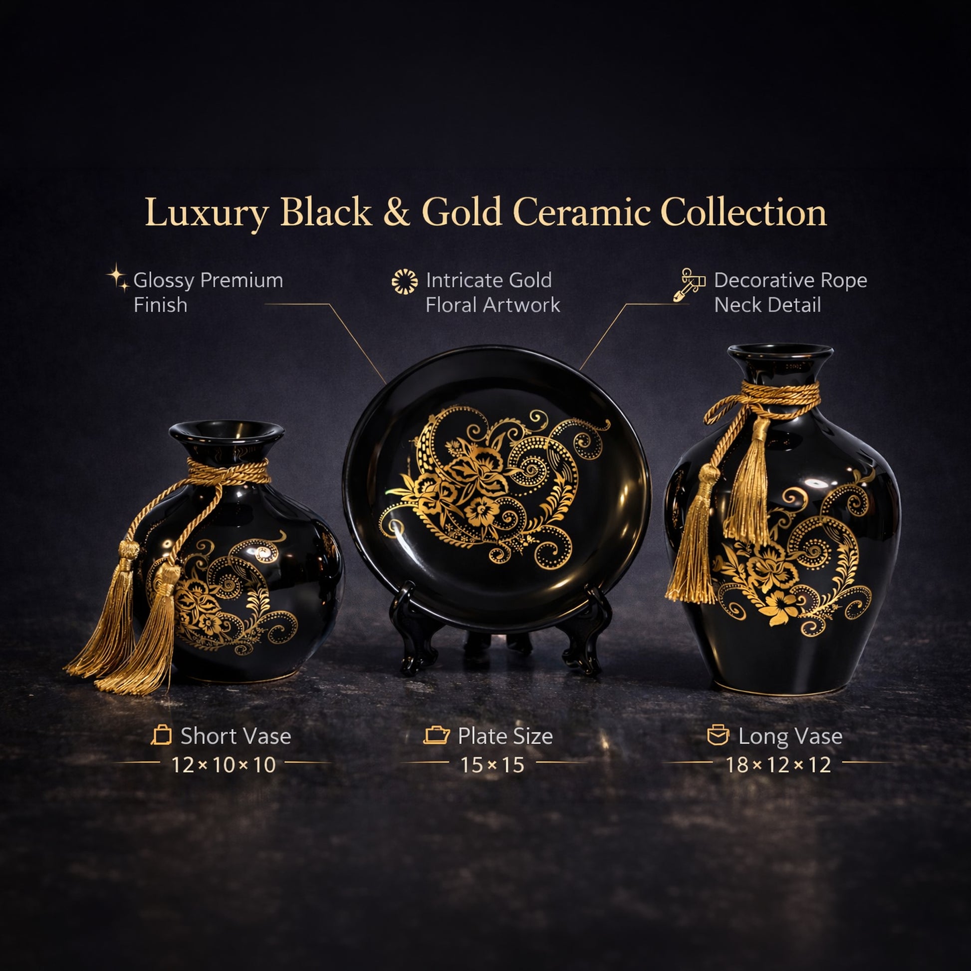 Luxury Black & Gold Ceramic Vase and Plate Set – Glossy Floral Decorative Showpiece with Rope Tassel Detail | Modern Home Décor Centerpiece (Set of 3) #3005
